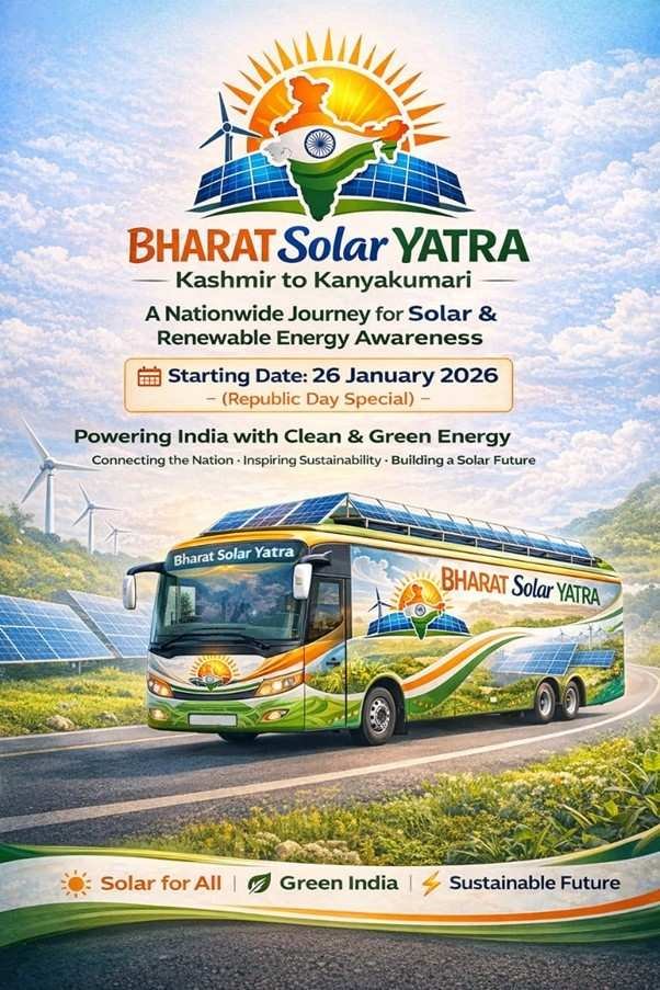 Launching on 26 January 2026, Bharat Solar Yatra is envisioned as India’s longest solar and renewable energy awareness journey, travelling from Kashmir to Kanyakumari, covering 17+ states and 30+ cities. More than a road expedition, the Yatra is a national movement designed to connect policy, industry, youth, and citizens around a shared goal: a cleaner, self-reliant, and energy-secure India.